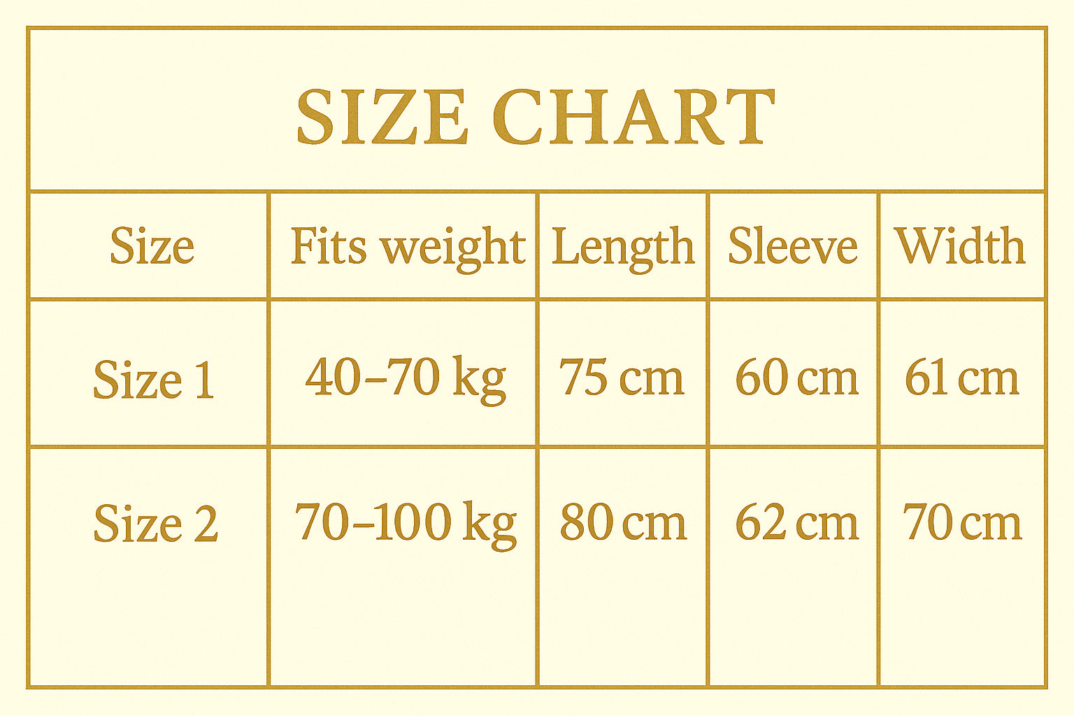Fits weight: 40-70 kg | Length: 75 cm | Sleeve: 60 cm | Width: 61 cm