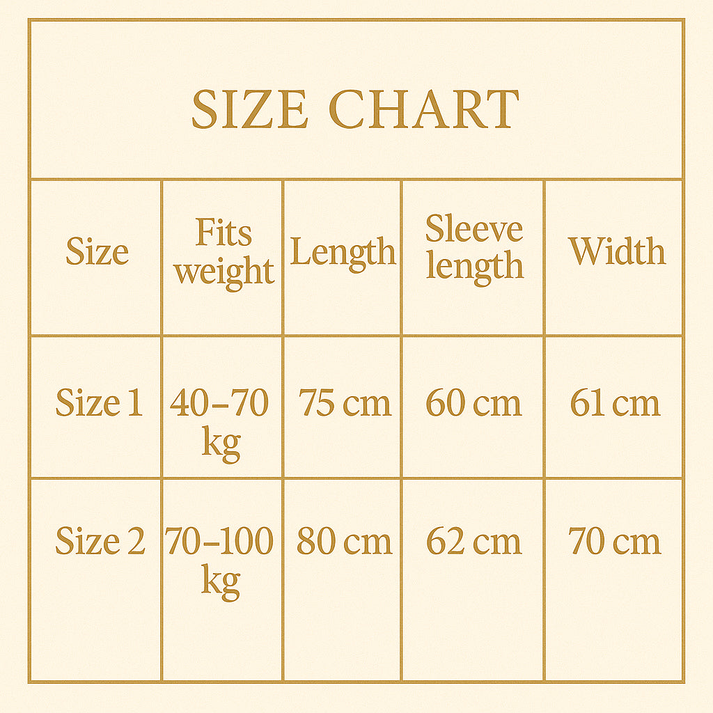 Fits weight: 40-70 kg | Length: 75 cm | Sleeve: 60 cm | Width: 61 cm